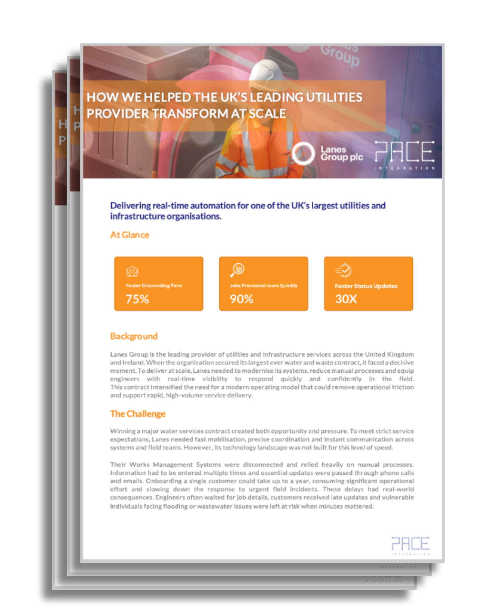Pace Integration partnered with Lanes to deliver a cloud-native, reusable integration layer through Pace-IMS. The solution connected work management systems end to end, automated job creation and prioritisation, and enabled real-time communication between systems, engineers and customers. Continuous delivery pipelines ensured fast, stable and secure releases.